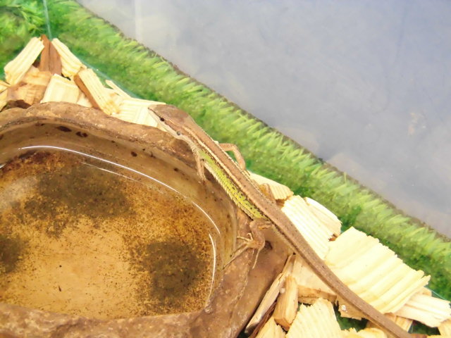 ケージ内には潜れるくらいの床材と広くて浅い水場を用意してあげてください。